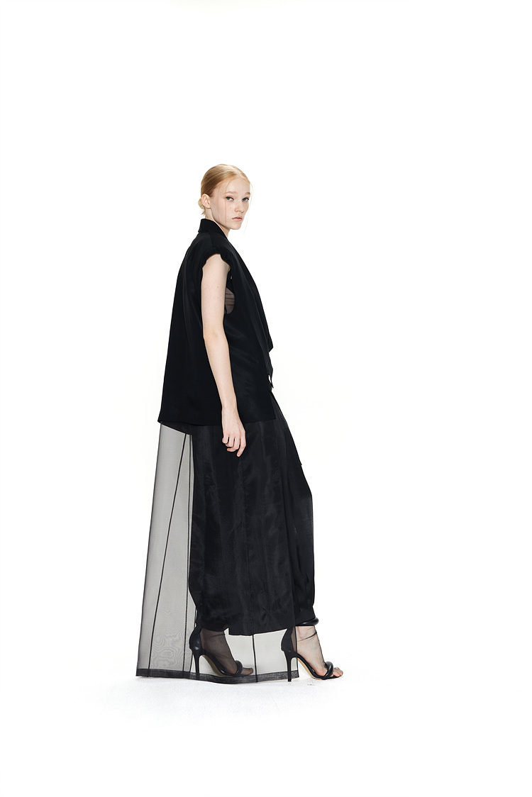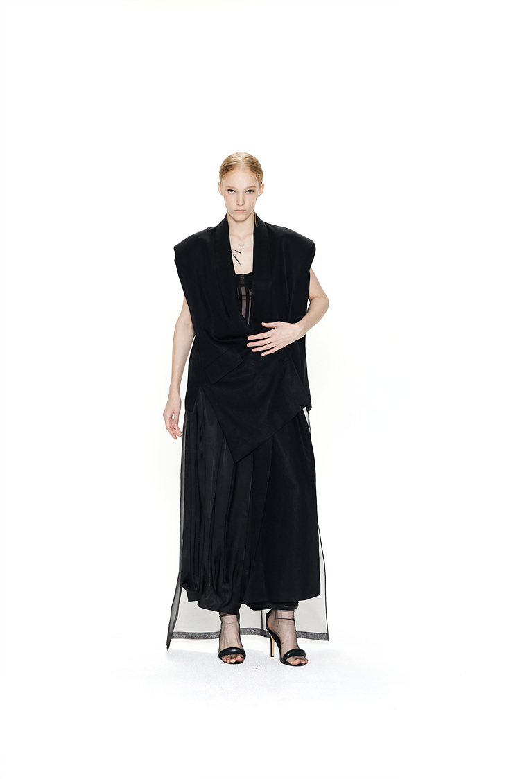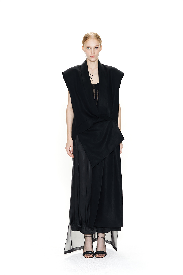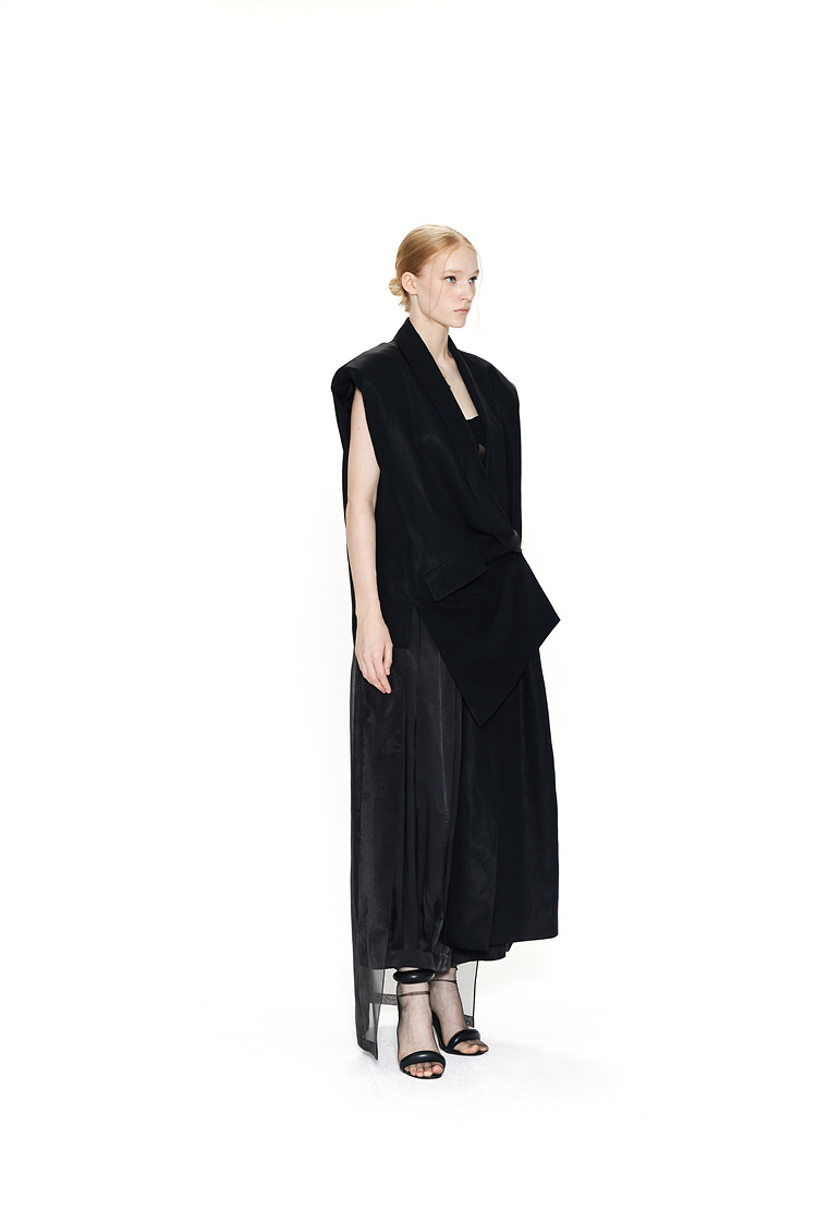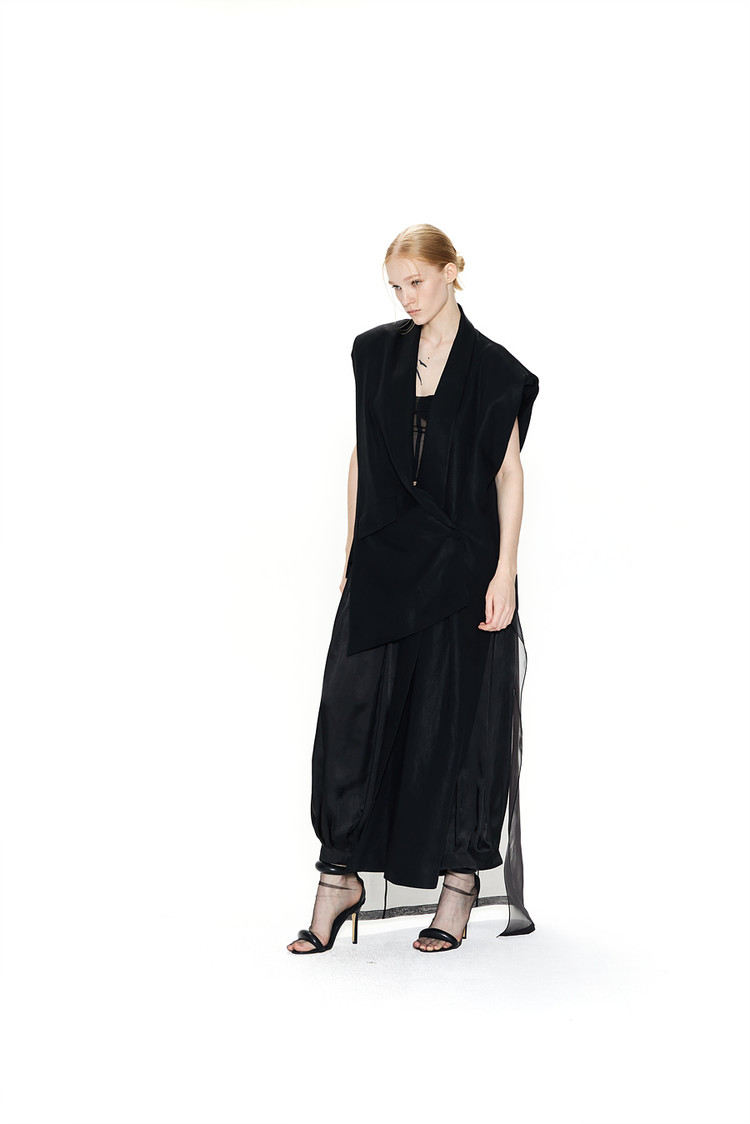 A DRAPE ORGANZA-MATCHED VEST-STYLE COAT